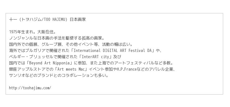 大阪在住、世界を舞台に活躍するノンジャンル日本画家、十一(トヲハジム)さんの作品展「最初の晩餐、世界のはじまり- THE FIRST SUPPER, THE BEGINNING OF THE WORLD -」が、大阪・梅田/中崎町のカフェ「colors」店内で開催されます。