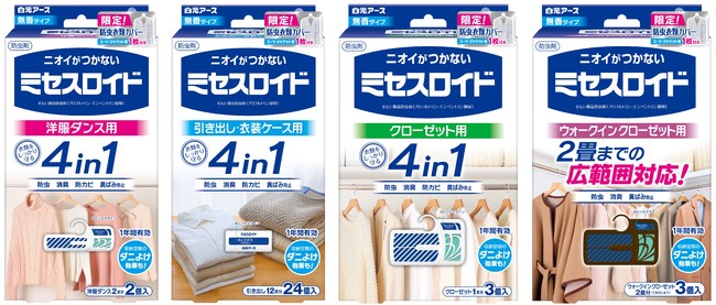 今回、充実した機能はそのままに、白を基調とした清潔感のあるパッケージデザインにリニューアルします。正面には大切な衣類を守る4つの機能が1つに備わっていることを表した「4in1(フォーインワン)」を大きく配置し、消費者への訴求を高めています。ラインナップは「洋服ダンス用」「引き出し用」「クローゼット用」「ウォークインクローゼット用*」の4種類で展開します。