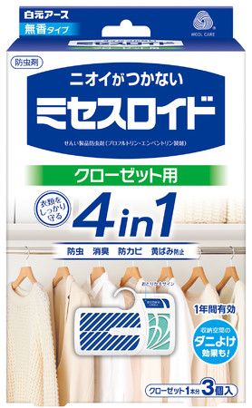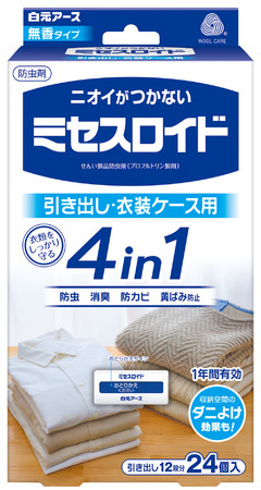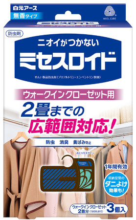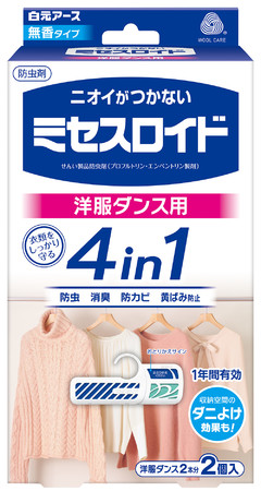 ミセスロイドは1988年に発売した衣類用防虫剤のロングセラーブランドです。2015年に「防虫」「消臭」「防カビ」「黄ばみ防止」という大切な衣類を守る4つの機能を、2017年に「収納空間のダニよけ効果※」を搭載し、多機能衣類用防虫剤として好評をいただいてきました。