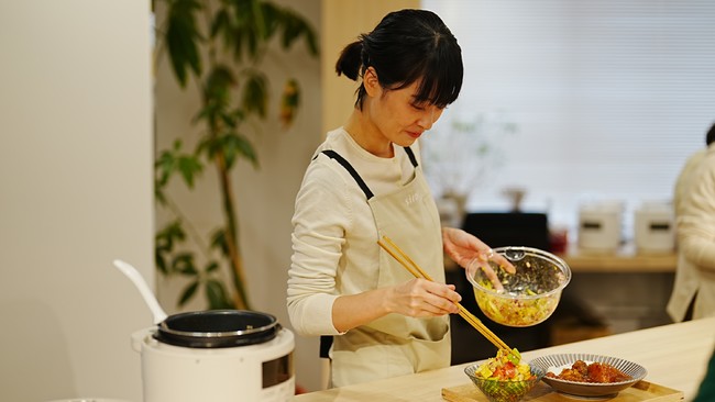 イベントでは、多彩な機能で幅広い調理が可能なシロカの電気圧力鍋「おうちシェフPRO」を使い、もあいかすみさんのオリジナルレシピ「極上キムチカレー」「タンドリーサラダチキンのインディアンサラダ」を実際に調理。レシピとともに、製品の使い勝手などを紹介しました。また、Instagramでの料理に関する投稿で多くの支持を集めているインフルエンサー8名にご参加いただき、実際に「おうちシェフPRO」で調理してみてのリアルな声を伺いました。