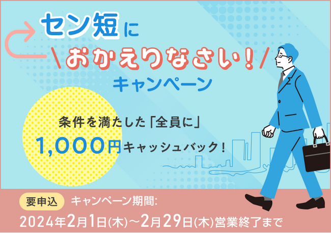 セントラル短資FX株式会社(本社:東京都中央区、代表取締役社長:宮下 俊郎)は、2024年2月1日(木)から2月29日(木)まで、「セン短におかえりなさい!キャンペーン」を実施します。