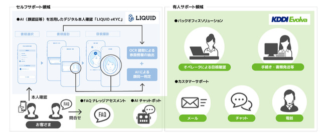 なお、KDDIエボルバでは、「LIQUID eKYC」導入に伴うお客さまからのお問合せ、本人確認後の事務処理にかかる対応に、デジタルチャネルと有人チャネル、バックオフィス業務のハイブリッド型カスタマーサポートを設計し、トータル運用している実績があります。