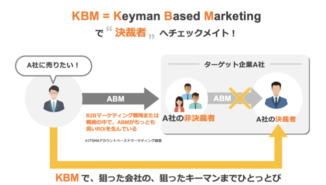 マーケティング活動におけるターゲティングを「会いたい企業(Account)」を超えた「会いたいキーマン・決裁者(Keyman)」まで絞って接点を作ることで、より効率的なマーケティング活動を行うことができる『KBM(Keyman Based Marketing)モデル』の開発と提供を進めています。