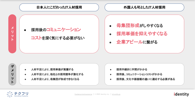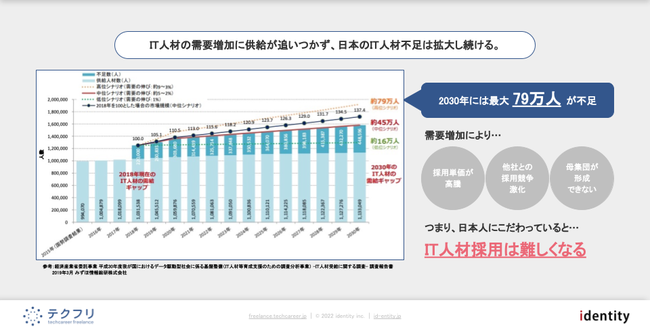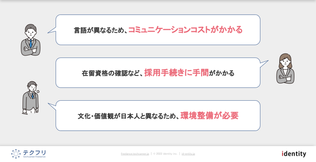 ITフリーランスエンジニアの案件・求人サイト「テクフリ」(https://freelance.techcareer.jp/)を運営する株式会社アイデンティティー(東京都新宿区、以下「当社」)は本日、「今、外国人エンジニアの採用を検討すべき理由」を作成・公開しました。