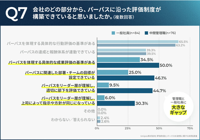 今回の調査では、「パーパス経営のための取り組みが十分か」については一般社員・管理職ともに約8割が肯定的な回答をした一方で、「パーパスをリーダー層が理解し、適切に部下を評価できているか」「パーパスに関連した部署・チームの目標が設定できているか」といった項目については一般社員と管理職で回答に大きなギャップが生まれるという結果が得られました。