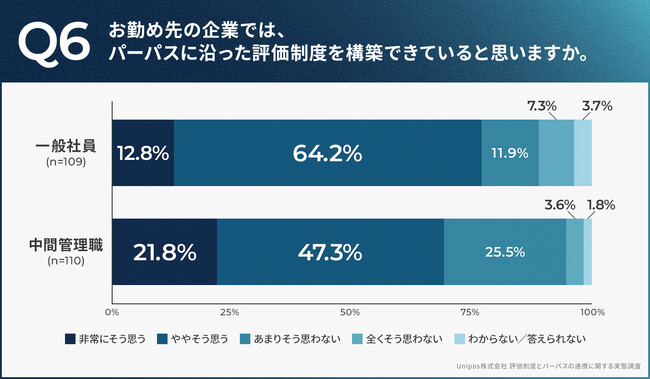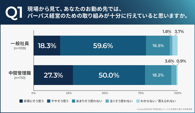 カルチャーを変え、人と組織の力を引き出すWebサービス「Unipos」を提供するUnipos株式会社(本社:東京都渋谷区)は、パーパスを掲げている上場企業勤務の一般社員109名と中間管理職(部課長)110名を対象に、パーパスの浸透に関する調査を実施いたしました。