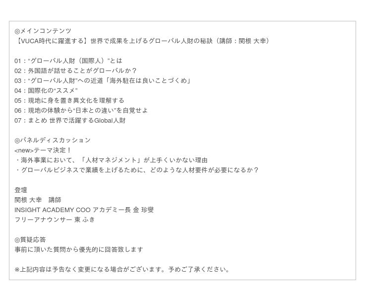グローバル人材育成・研修業を手掛けるインサイトアカデミー株式会社(本社:東京都港区六本木、代表取締役:北村 嘉章)は、2022年7月7日(木)18時より開催の無料zoomセミナー「世界で成果を上げるグローバル人財の秘訣」のパネルディスカッションテーマを決定しました。