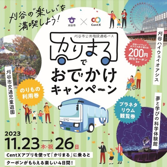 エリア版MaaSアプリCentXの「エリアdeふらっとウォーク」機能の新たなコースとして、刈谷市が主催する「かりまるでおでかけキャンペーン”刈谷の楽しいを満喫しよう!”」を11月23日から実施します。