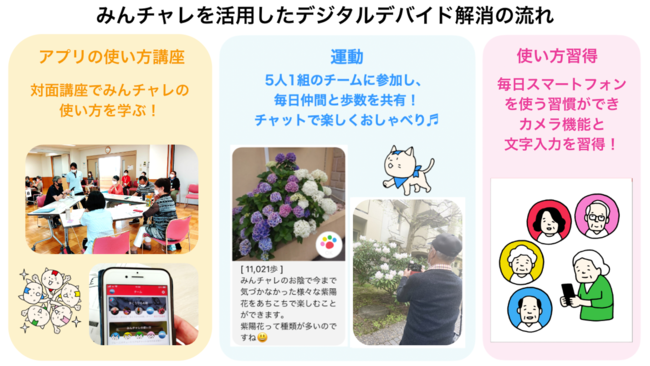本事業では、墨田区の老人クラブ向けにみんチャレの使い方講座を実施します。高齢者は、みんチャレを活用して地域の仲間同士5人組のチームに参加し、毎日写真とコメントを投稿して仲間と交流することで、楽しみながら文字入力とカメラ機能が習得できるようになります。昨年墨田区が実施したスマホ講座の結果より、高齢者がスマホ操作を覚えるためには、基礎的な講座に加えてスマホを日常使いする機会を提供することが必要とわかり、この度みんチャレの導入にいたりました。