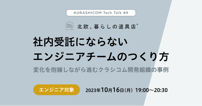 ライフカルチャープラットフォーム「北欧、暮らしの道具店 」において、雑貨や衣類などの開発・販売、メディア運営などを行う株式会社クラシコム(本社:東京都国立市、代表取締役社長:青木耕平、以下「当社」)は、 2023年10月16日(月)19:00-20:30 エンジニア向けトークイベント「KURASHICOM Tech Talk #4」を「社内受託にならないエンジニアチームのつくり方」をテーマに開催します。(URL: https://connpass.com/event/297590 )