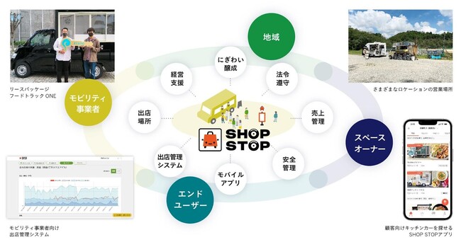 キッチンカーをはじめとした店舗型モビリティビジネス向けのプラットフォームです。現在、営業場所780カ所、登録店舗数1920店と日本最大規模となっており、全国20都道府県で営業を実施済み(実証実験含む)で、今後もエリア拡大を加速していきます。また、多種多様なキッチンカーを手軽に探すことができるSHOP STOPアプリでは、個店の情報として分散しがちなキッチンカーの情報を集約し、集客機会や顧客接点を創出しています。また、ハイブリッドワークに適した「勤務地・自宅登録機能」や、「気になるお店の通知機能」も搭載するなど、キッチンカー事業者、顧客双方の課題の解決や、社会の変化に応じたアップデートを続けています。