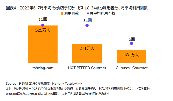 最後に、TARPが最も高かった18-34歳の利用状況をサービス別に見ると、利用者数ではtabelog.comが最も多く525万人で、HOT PEPPER Gourmetが271万人で続いていました。さらに、平均利用回数では2サービスが月平均11回で最も多くなっていました(図表4)。