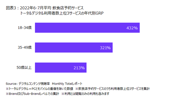 そして、飲食店予約サービスにおける利用者数ランキング上位3サービスを合計したターゲットGRP(TARP)を年代別に見ると、18-34歳で最も高く432%となっていました。次いで35-49歳で321%となっていました(図表3)。