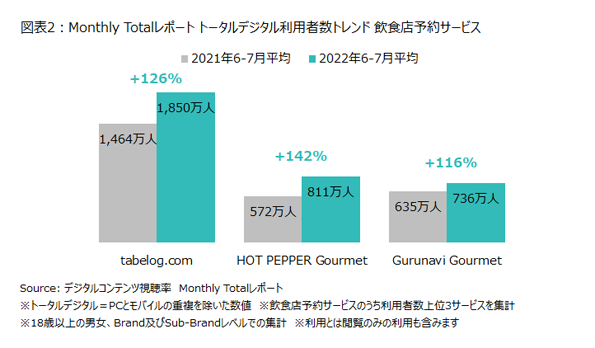 また、飲食店予約サービスのうち6-7月平均利用者数の上位3サービスでは、すべてのサービスにおいて利用者数が昨年同月期と比べて増加し、HOT PEPPER Gourmetでは最も増加率が高く1.4倍になっていました(図表2)。