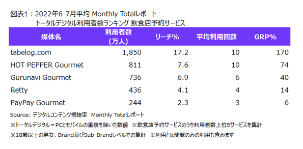 2022年6-7月のニールセン デジタルコンテンツ視聴率 Monthly Totalレポートによると、飲食店予約サービスにおいて、PCとモバイルの重複を除いたトータルデジタルの利用者数が最も多かったのはtabelog.comで1,850万人が利用しており、HOT PEPPER Gourmetが811万人で続いていました。また、平均利用回数では、tabelog.comとHOT PEPPER Gourmetが共に月平均10回で最も多くなっていました(図表1)。
