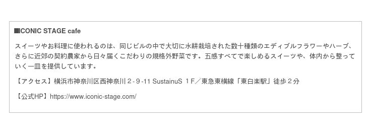 ICONIC STAGE cafeならではのSustainuS farmで育てた新鮮な葉野菜やハーブを活かしたセイボリーやスイーツ等、ICONIC STAGE cafeの魅力ある部分を凝縮した内容です。紅茶は、茶葉本来のナチュラルな味わいや新鮮さにこだわっている、藤沢の紅茶専門店ティー・イソブチカンパニー様の厳選された5種のスリランカの紅茶を提供します。