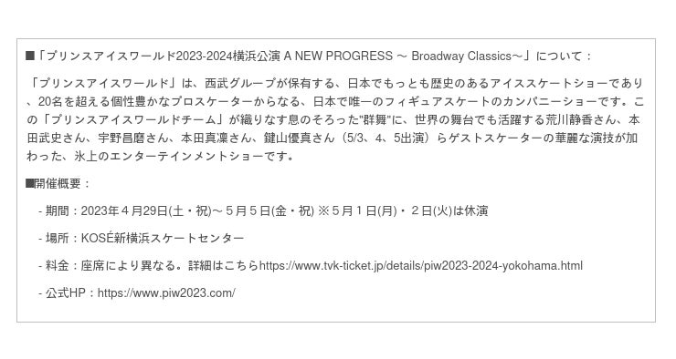 公益財団法人横浜観光コンベンション・ビューロー(所在地:神奈川県横浜市中区山下町2、理事長:布留川信行/以下、YCVB)は、株式会社ブルーミューズ(本社:東京都豊島区南池袋1-16-15、代表取締役社長:安孫子学)が、2023年4月29日(土・祝)〜5月5日(金・祝)に開催する「プリンスアイスワールド」横浜公演を記念して、横浜市内2つのカフェと連携したコラボレーション企画を実施します。