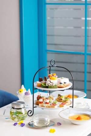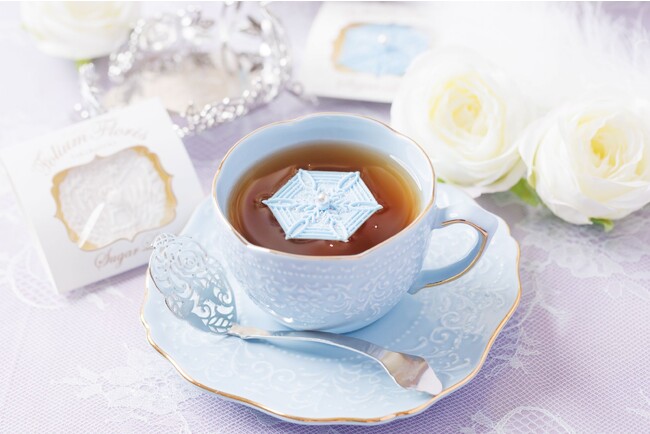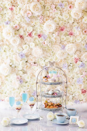 アイススケートをイメージした、さわやかな水色に彩られたスペシャルアフタヌーンティーセット。花々に囲まれた店内で、みずき愛さん制作の雪の結晶デザインのシュガーレースPATを紅茶に浮かべて、氷のプリンセスになった気分で、優雅で特別なひとときを過ごせます。