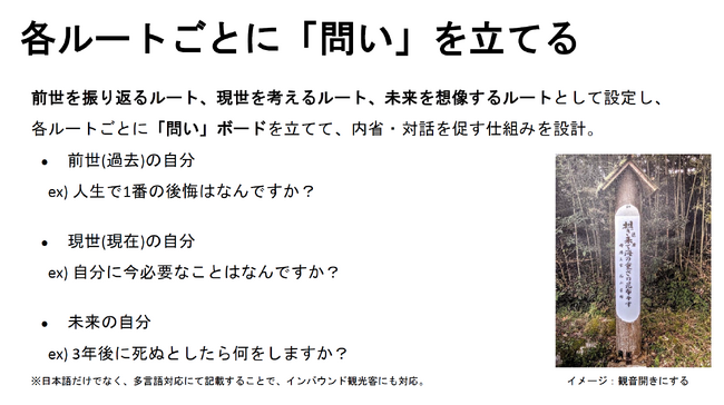熊野三山が前世・現世・来世をそれぞれ司っていることに着目し、過去や現在を振り返り、未来について考えるボードを古道沿いに設置することを提言しました。