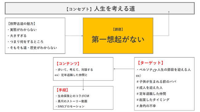 日本人にとって熊野古道の第一想起がはっきりしていないという課題を踏まえた上で、結婚や定年退職などライフステージごとに人生を考えるタイミングは誰しもに訪れることから、ターゲットを絞る必要がなく、幅広い層に訴求できるのではないかと提案しました。