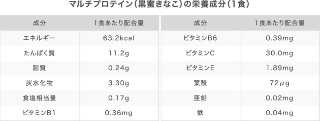 ビタミンB1・ビタミンB6・ビタミンC・ビタミンE・葉酸は、栄養機能食品の規格基準を満たしており、特にビタミン類は1食分(標準17g)で成人女性の1食の所要量の大部分を摂取可能。