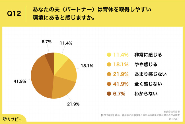 「Q12.あなたの夫(パートナー)は育休を取得しやすい環境にあると感じますか。」(n=105)と質問したところ、「あまり感じない」が21.9%、「全く感じない」が41.9%という回答となりました。