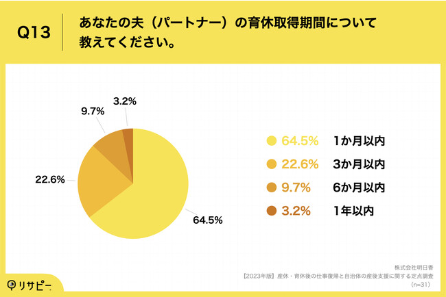 Q11で「現在取得している」「過去に取得したことがある」と回答した方に、「Q13.あなたの夫(パートナー)の育休取得期間について教えてください。」(n=31)と質問したところ、「1か月以内」が64.5%、「3か月以内」が22.6%という回答となりました。