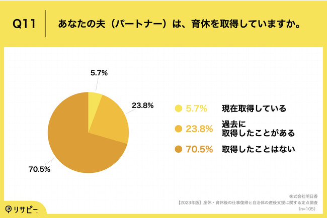 「Q11.あなたの夫(パートナー)は、育休を取得していますか。」(n=105)と質問したところ、「取得したことはない」が70.5%という回答となりました。