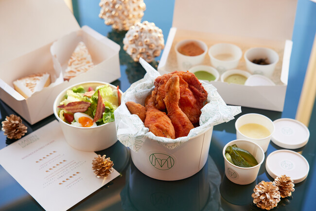 ミシュランスターシェフ、ダニエル・カルバート 独自の製法で12時間以上スパイスに付け込んだフライドチキン。表面はサクサク中身はジューシーなチキンは一度食べたらやみつき!テイクアウトパッケージには、フライドチキン、コブサラダ、蒸したケール、マッシュドポテト、コーンブレッド、自家製ピクルス、ランチドレッシング、レモンメレンゲパイが含まれています。料金: 5,940円