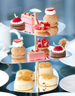 果実をベースにしたスイーツでスペシャルなアフタヌーンティーを。当ホテル自慢のパティシエチームが考案したメニューは、イチゴとカシスのムース、イチゴのアーモンドバー。ハイライトは、フランスのヴァンショー(ホットワイン)をイメージした、イチゴ、ポートワイン、オレンジピールそしてホイップクリームの絶妙な組み合わせのストロベリーシュー。日本の柑橘系果実をふんだんに使っています。