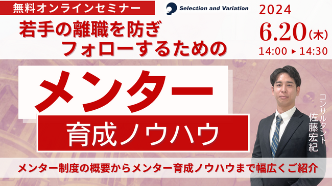 組織・人事コンサルティングファームであるセレクションアンドバリエーション株式会社(以下、当社、東京都千代田区丸の内、東京都港区青山、大阪市西区、名古屋市西区 / 代表取締役社長:平康慶浩/ URL:https://sele-vari.co.jp/)は「若手の離職を防ぎフォローするためのメンター育成ノウハウ」セミナーを2024年6月20日(木)14:00〜14:30に開催することをお知らせいたします。