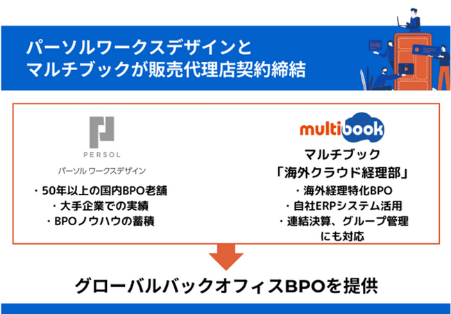パーソルワークスデザイン株式会社(本社: 東京都豊島区、代表取締役社長: 軽井 宏直、以下パーソルワークスデザイン)は、株式会社マルチブック(東京都品川区、代表取締役CEO:渡部 学、以下マルチブック)と販売代理店契約を締結し、グローバル企業向けクラウド型会計・ERPサービス「multibook」やBPO*1サービス「海外クラウド経理部」の提供を開始しました。これにより、パーソルワークスデザインでは海外拠点をもつグローバル企業に対して、国内のみならず海外現地法人まで一貫した経理業務のDX支援が可能となり、海外進出企業のバックオフィスにおける人材不足問題を解決します。