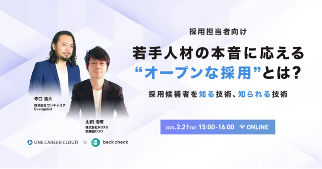 株式会社ROXX(本社:東京都新宿区、代表取締役:中嶋汰朗、以下ROXX)が開発・提供する、オンライン完結型リファレンスチェックサービス『back check』は、2023年2月21日、オンラインセミナー「若手人材の本音に応える『オープンな採用』とは? 〜採用候補者を知る技術、知られる技術〜」を開催いたします。採用DXを実現する新卒採用サービス『ONE CAREER CLOUD』を手掛ける、ワンキャリア Evangelist 寺口浩大氏をお招きし、ROXX 取締役COOの山田とパネルディスカッション形式で、若手世代の価値観の変化からキャリア志向性を紐解き、さらに優秀な若手人材を惹きつける「オープンな採用」を体現するための手法について議論を深めます。