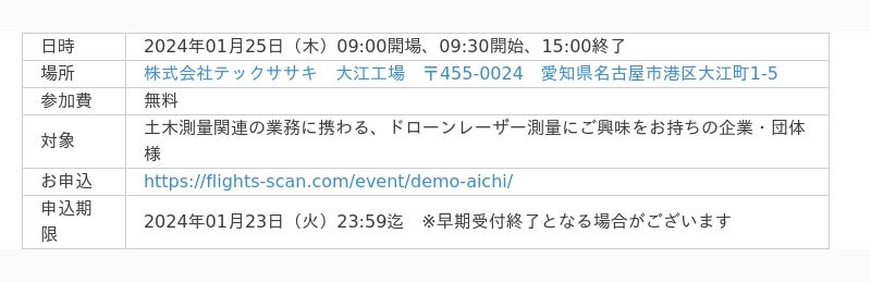 〜過去の東海エリア開催分はご好評につき早期受付終了。話題の公共測量対応ドローンレーザー実演会を、1/25に名古屋で初開催!建設・測量業に携わる企業・団体様に、データ取得から解析手順をご紹介します〜