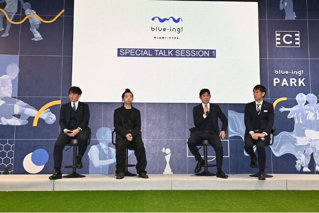 blue-ing!は、JFAと三井不動産株式会社が2021年に締結した「サッカーの力を活用した街づくり連携および拠点再編に関する基本協定」における共同プロジェクトの一つとして進めてきたもので、筑波大学デジタルネイチャー開発研究センター長の落合陽一氏監修の下、「“未来”につなぐ、コミュニケーションと創造の場」をコンセプトにした次世代型の体験型コンテンツや最新のデジタル展示、AI自動生成などが楽しめるエリアのほか、イベントスペースやカフェ&バー、サッカーショップなども併設。