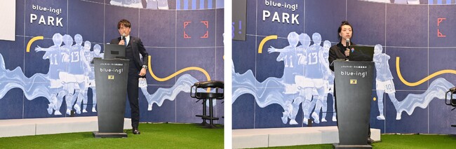 はじめに、公益財団法人日本サッカー協会専務理事 宮本恒靖より、主催挨拶、施設のコンセプトを説明。JFAや代表ユニフォームを象徴する”BLUE”に染まることに願いを込めて施設名がつけられたという想いを話しました。