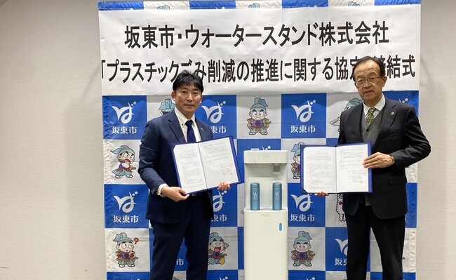 坂東市と当社は、プラスチックごみ削減の実現に向け、互いの連携・協力の下、市内施設に給水環境を整備しマイボトルの利用促進を図るため、協定を締結いたします。マイボトルへの給水が可能なウォータースタンドを各所に設置し、リユース可能な容器を活用することを通じて地球環境に配慮した活動の拡大を図って参ります。