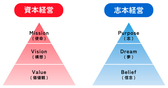 資本経営の時代においては、Mission(使命)Vision(構想)Value(価値観)が一般的でした。この「MVV」は外発的な観念です。一方で、志本経営におけるPurpose(志)Dream(夢)Belief(信念)「PDB」は自身の内側から湧き出てくる、より内発的な観念です。