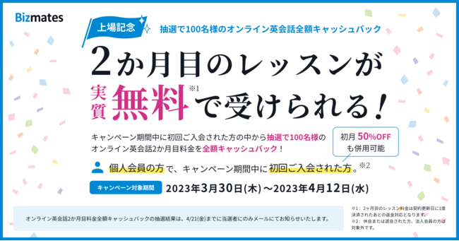 ビジネス特化型オンライン英会話事業「Bizmates」(https://www.bizmates.jp/)を展開するビズメイツ株式会社(東京都千代田区、代表取締役社長:鈴木 伸明 、以下「当社」と言う。)は、東京証券取引所グロース市場への新規の上場を記念し、2023年3月30日(木)〜4月12日(水)の期間限定で、抽選で100名様に2か月目のレッスン料が全額無料(※1)になるキャンペーン(https://www.bizmates.jp/promotions/CashBackCampaign.pdf)の実施を開始いたしました。