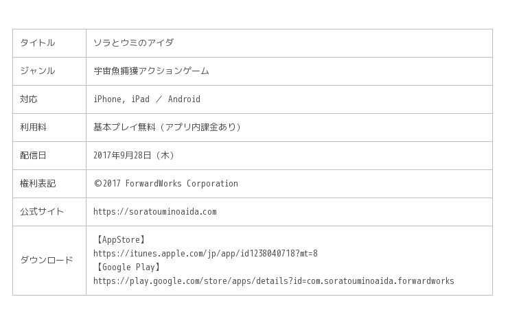 株式会社フォワードワークス(以下FW)は、スマートフォン向け宇宙魚捕獲アクションゲーム『ソラとウミのアイダ』において、2018年1月29日(月)より、6人の宇宙漁師候補生が、周囲の人々との交流を通じて成長する姿を描く「メインストーリー」に30話を追加するとともに、爽快なアクションが楽しめる「宇宙漁業」には47号イケス(暗黒に誘う渦巻き)を追加いたします。