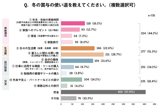 1.特別手当「お年玉」の使い道で最も多い回答は、年末・年始の家族時間や帰省、家族旅行などの「家族還元」。次いで、日々の生活費や自己投資と続きました。