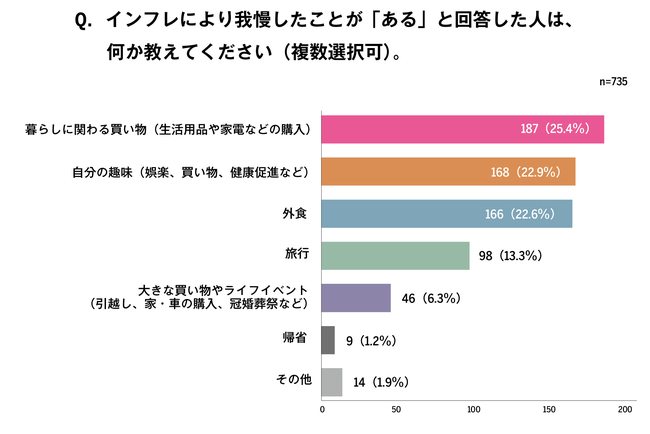 5.インフレ下で我慢したことがあると回答した約52%のうち、その内訳は1位「暮らしに関わる買い物(生活用品や家電などの購入)」、2位「自分の趣味」、3位「外食」でした。
