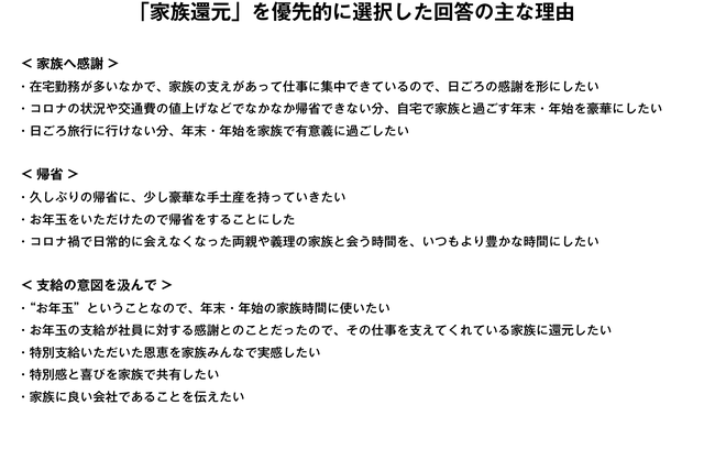 2.特別手当「お年玉」の使い道に「家族還元」を選択した理由には、「(在宅勤務のフォローや物価高でやり繰りしてくれているなどの)家族に日ごろの感謝として還元したい」「“お年玉”としてもらったので、家族が集う年末・年始に使いたい」「特別感を家族で共有したい」などがあがりました。