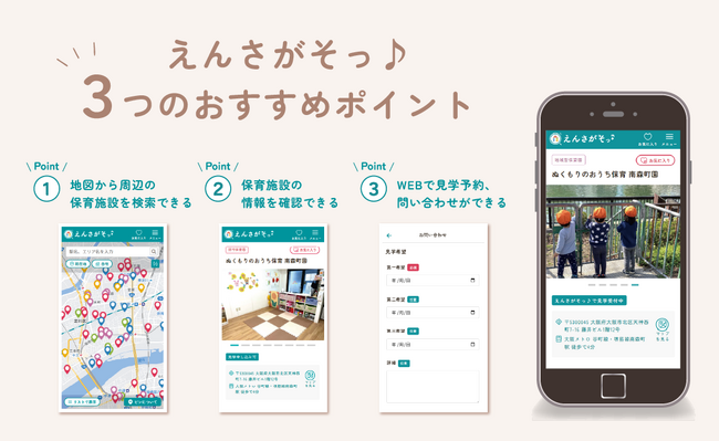 保護者は、「えんさがそっ♪」を利用することで、自宅や現在地付近の保育施設を地図上で簡単に検索できたり、気になる保育施設をお気に入り登録して後からまとめて見返せたり、お問い合わせや見学の申し込みをすることができます。授乳中や子どもが寝ている間でも、時間や場所を問わずに気軽に活用できるので、「保活」がもっとスムーズに行えるようになります。