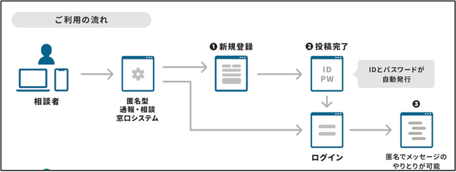 「匿名型通報・相談窓口システム」は、相談者がパソコンやスマートフォンから企業の人事・総務担当者などの対応者にコンプライアンス通報や女性特有の相談、キャリアやハラスメントなどにおける相談ができ、匿名性を保ったまま対応者とWeb上にてメッセージのやり取りがおこなえます。また、相談者は時間や場所の制約なく、自身の都合の良い状況で相談が可能です。
