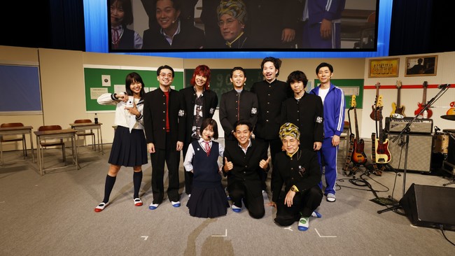 学ランを着用したオカモトショウ(Vo)、オカモトコウキ(G)、ハマ・オカモト(Ba)、オカモトレイジ(Dr)が幕の前に立ち、校歌斉唱からイベントはスタート。部室のセットでは、顧問の先生役の森本晋太郎(トンツカタン)、写真部生徒役の三原勇希、サポートメンバーのBRIAN SHINSEKAI(Key)が合流。その後登場するゲストたちは、「OKAMOTO’Sに足りないもの」についてレクチャーを授けていく、という設定である。