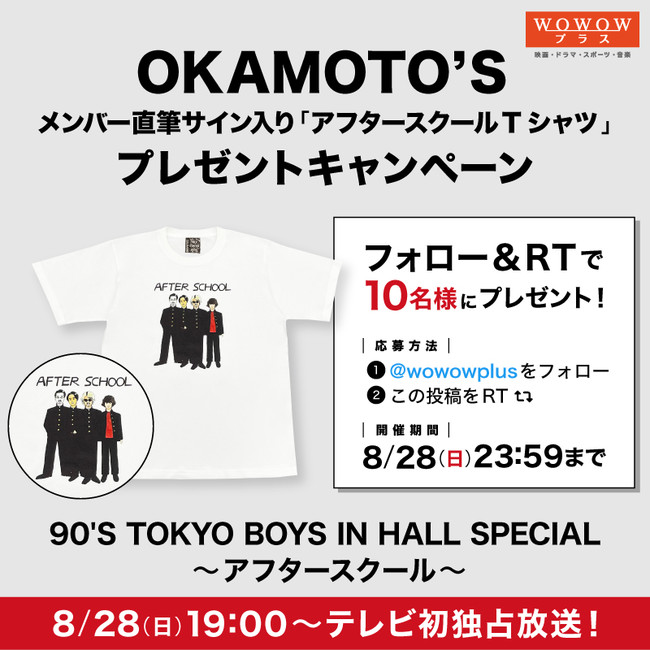 8月28日(日)19:00〜「90'S TOKYO BOYS IN HALL SPECIAL 〜アフタースクール〜」のテレビ初独占放送を記念して、WOWOWプラス公式Twitterにて、メンバー直筆サイン入り「アフタースクールTシャツ」を抽選で10名様にプレゼントするフォロー&RTキャンペーンを開催中!どしどしご応募ください。