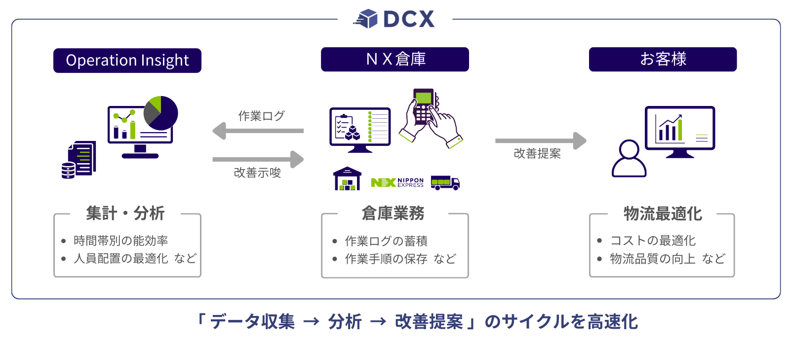 本サービスは、DCXを利用したNXグループ内の倉庫管理業務において、日々のオペレーションで蓄積された詳細な作業データを自動的に集計・分析し、現場改善やお客様への提案に活用できる仕組みです。