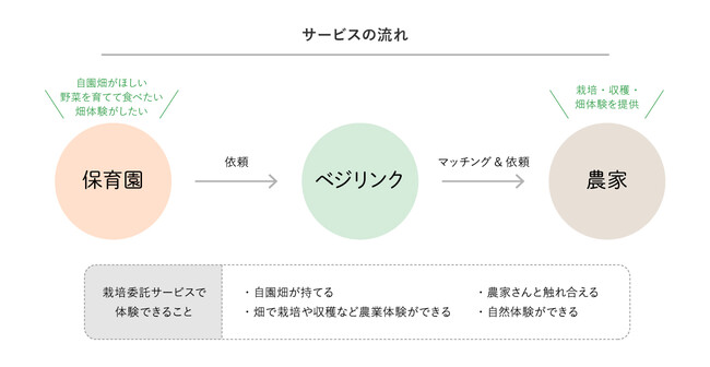 千株式会社(本社:東京都千代田区、代表取締役社長 千葉伸明、以下 千)と、株式会社ベジリンク(本社:東京都千代田区、取締役社長 塚田祥世、以下 当社)が共に運営する「はいチーズ!×ベジリンク」は、保育園が食育目的に自園畑を持つことができ、農家にとっても新しい安定した収入源とできる双方がウィンウィンとなる『栽培委託サービス』の提供を開始することをお知らせいたします。給食食材を流通する企業が、保育園が自園畑を持てるサービスを提供し、さらに栽培した野菜を給食食材として利用・流通までをサポートするのは業界初(※1当社調べ)となります。