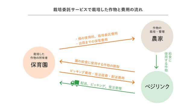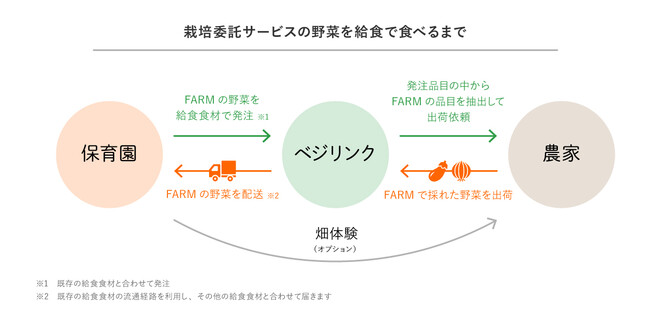 『栽培委託サービス』の契約期間中は、保育園は農家との交流や、作付け・管理・収穫などの畑体験が可能で、栽培・収穫した作物は園の所有物となります。収穫した食材を給食食材として使用する際には、ベジリンクが提供する給食食材配達サービスを活用し、保育園は他の給食食材発注とともに手軽に『栽培委託サービス』作物の注文を行えます。これにより、新鮮な状態の野菜を必要な量だけ、少しずつ給食食材として受け取ることが可能となります。(※3)